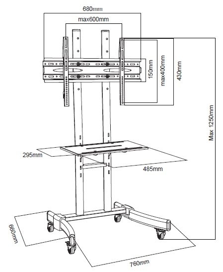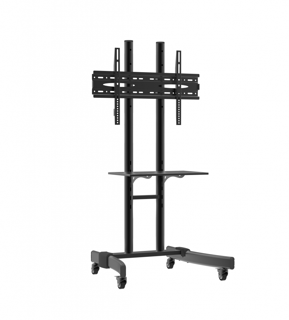 Jakościowy przenośny stojak z regulowaną wysokością do telewizorów LCD i LED o przekątnej do 65". Stabilna podstawa zapewnia dużą stabilność i bezpieczeństwo. Stojak jest mobilny, porusza się na kółkach z hamulcem, który zabezpiecza go w żądanym położeniu. W zestawie znajduje się półka. Półki mają regulowaną wysokość. Regulacja wysokości ekranu w 5 pozycjach. Stojak do telewizorów LCD i LED jest zgodny ze standardem VESA od 200x100 do 600x400, więc nadaje się do zawieszania ekranów o przekątnej od 32" do 65".